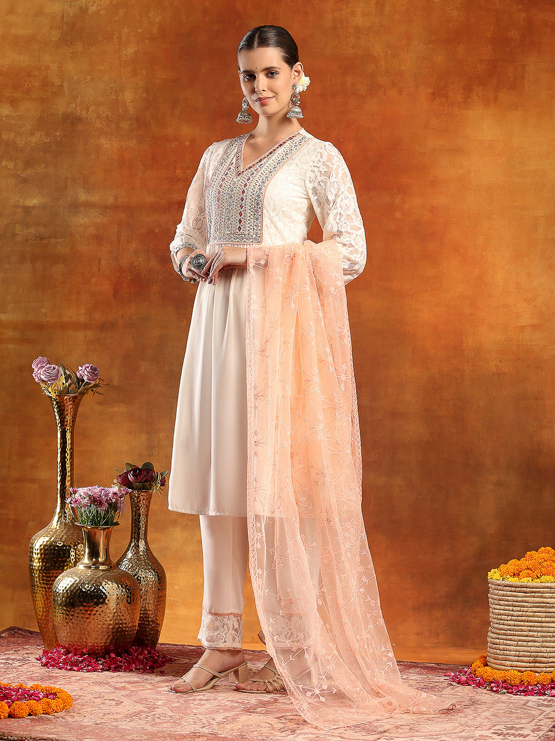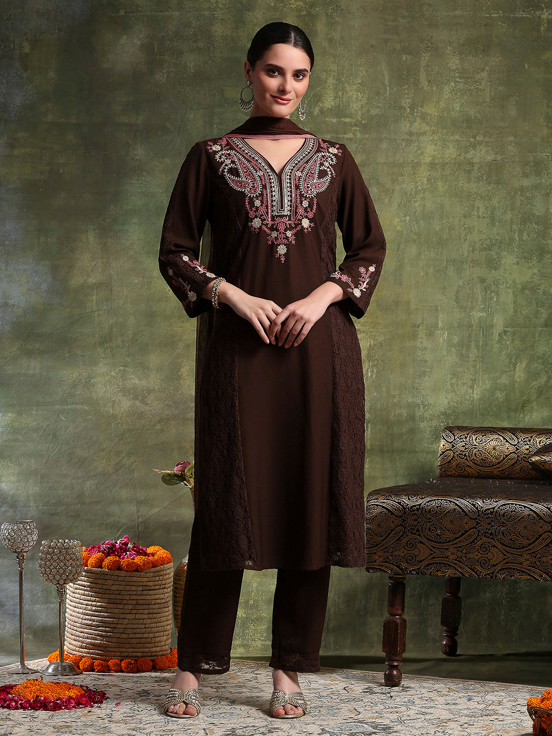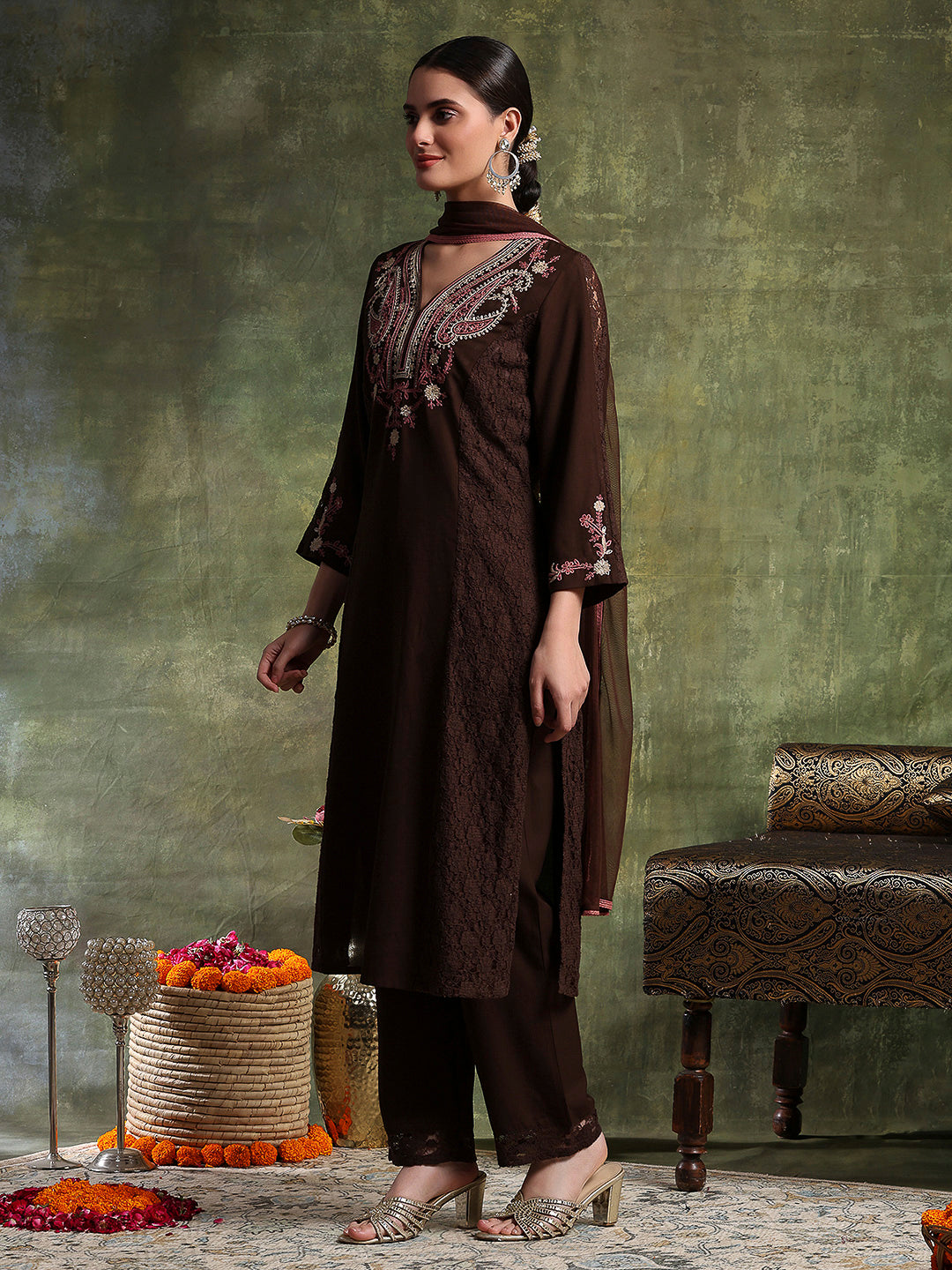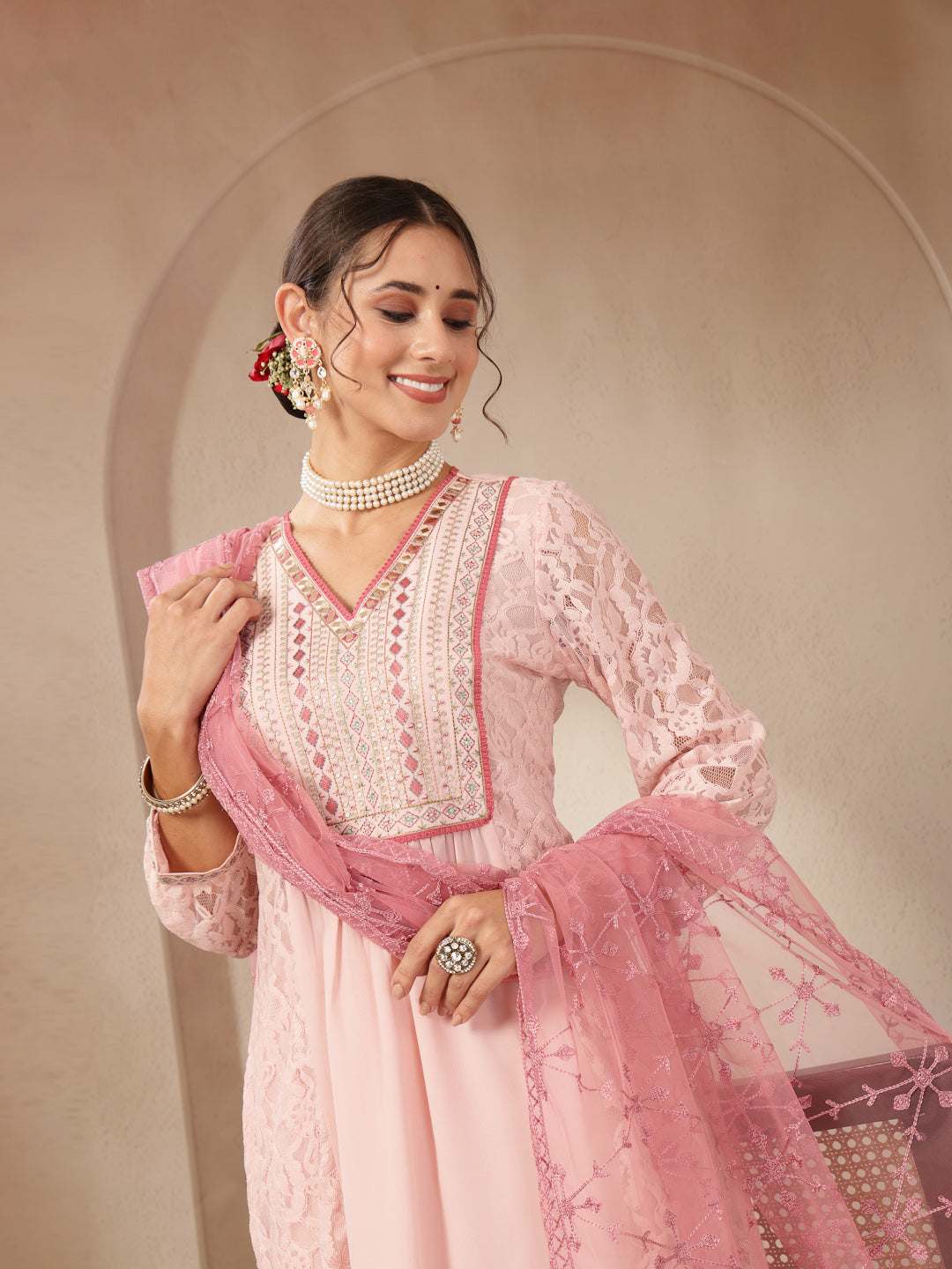 Crepe & Raschel Embroidered Kurta Set with Lace-Edged Mesh Dupatta