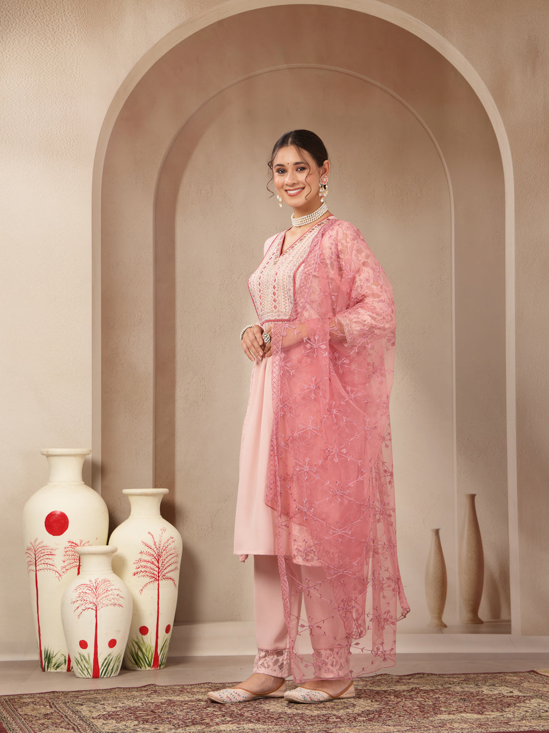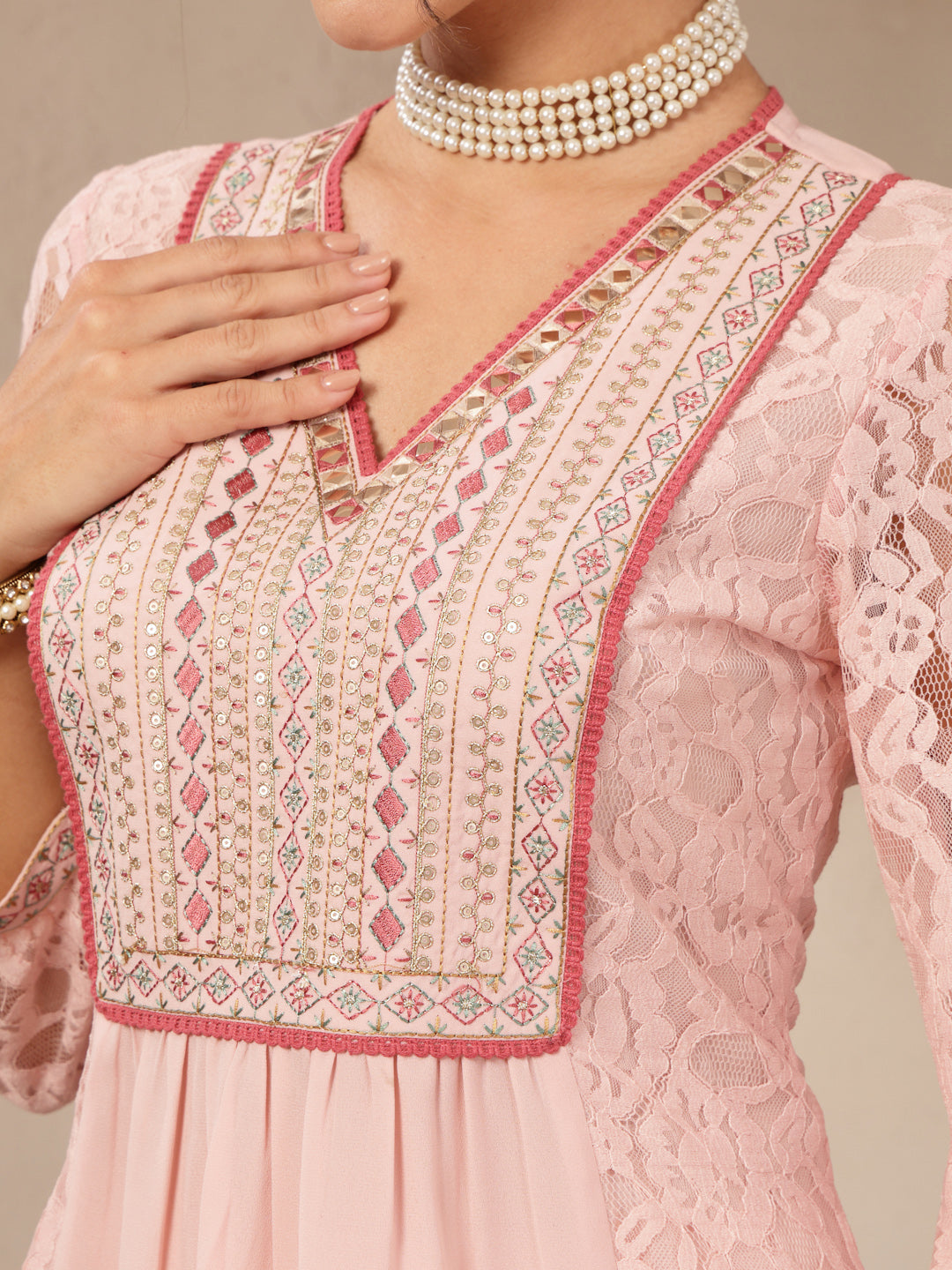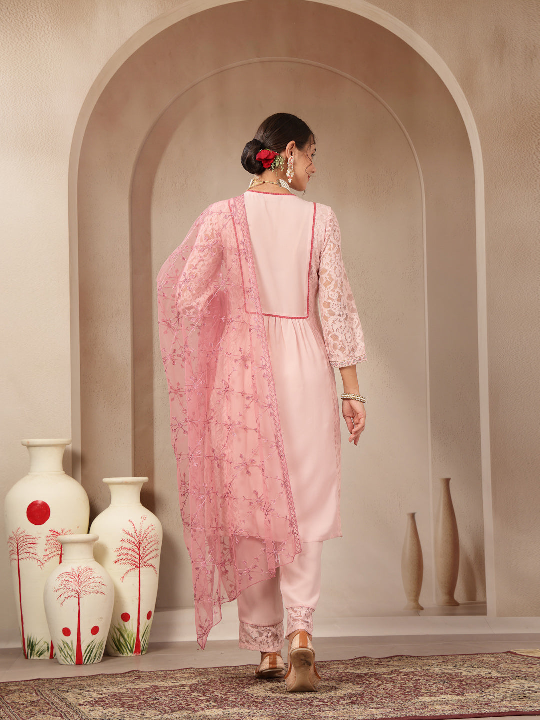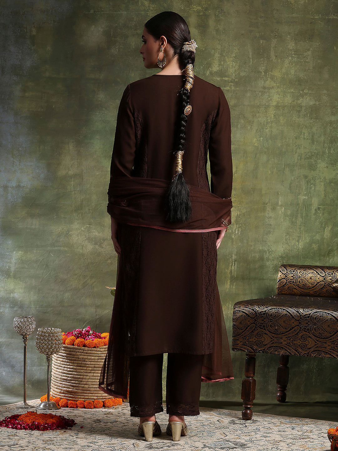 Crepe & Raschel Embroidered Kurta Set with Lace-Edged Mesh Dupatta