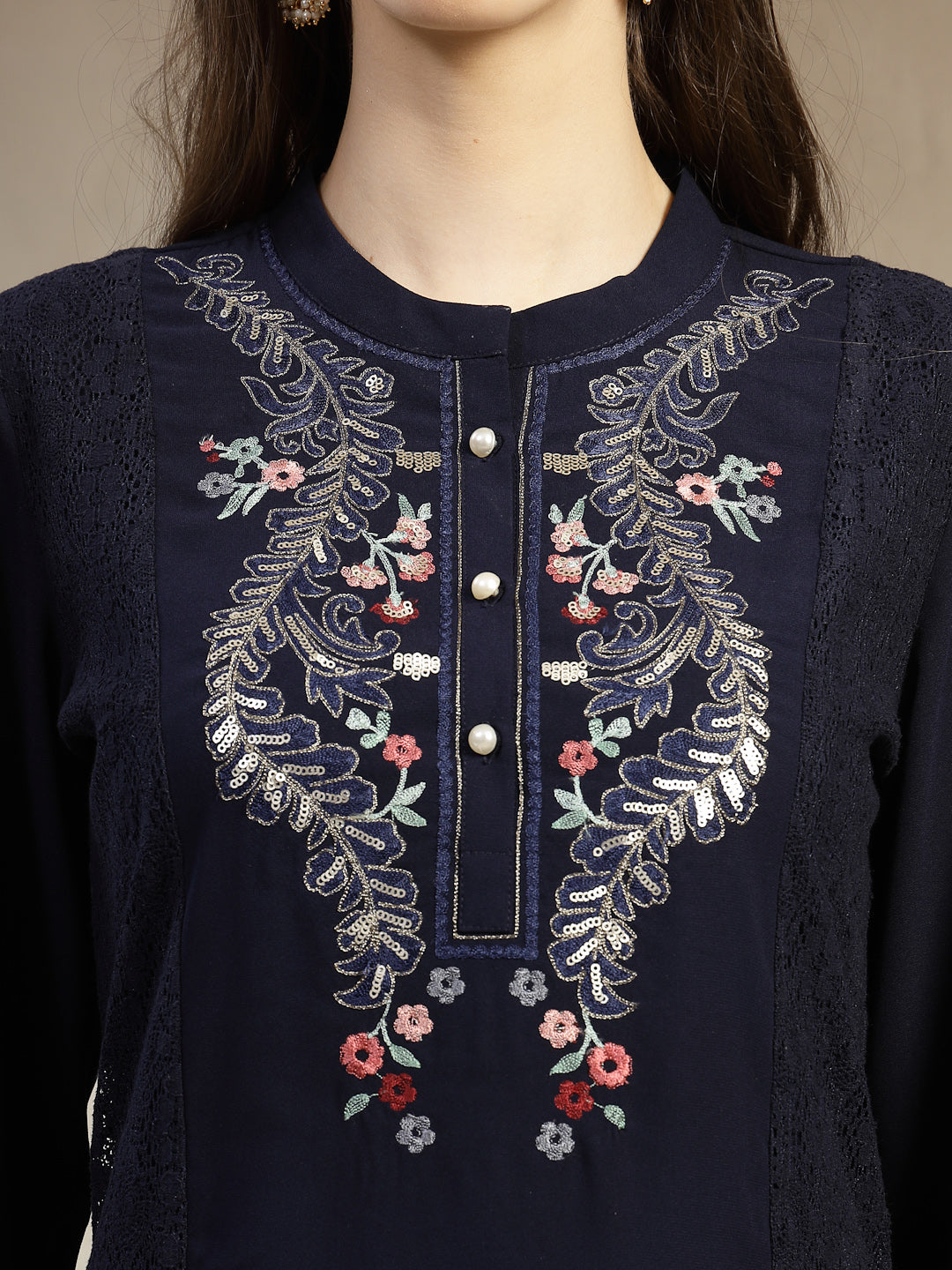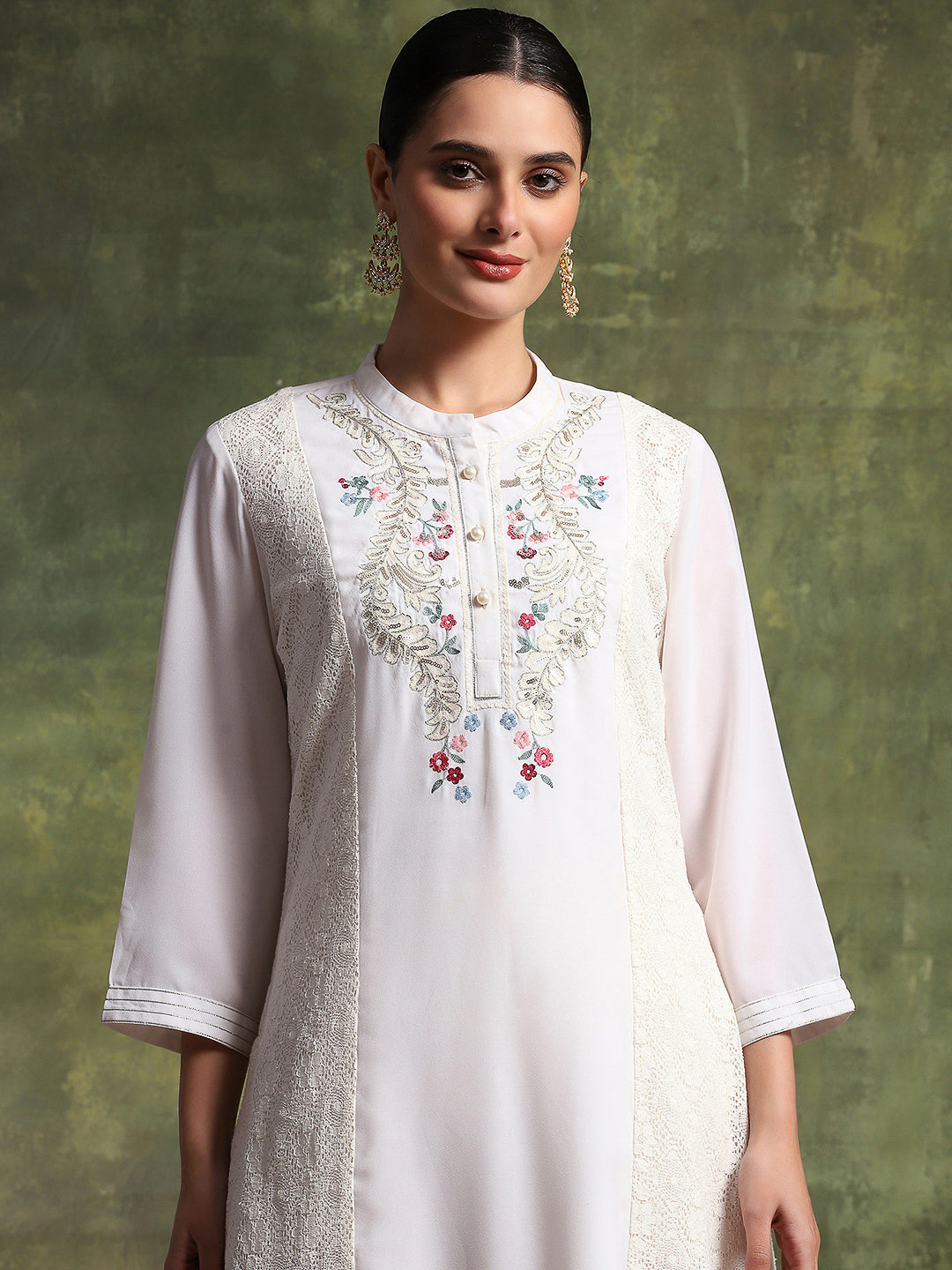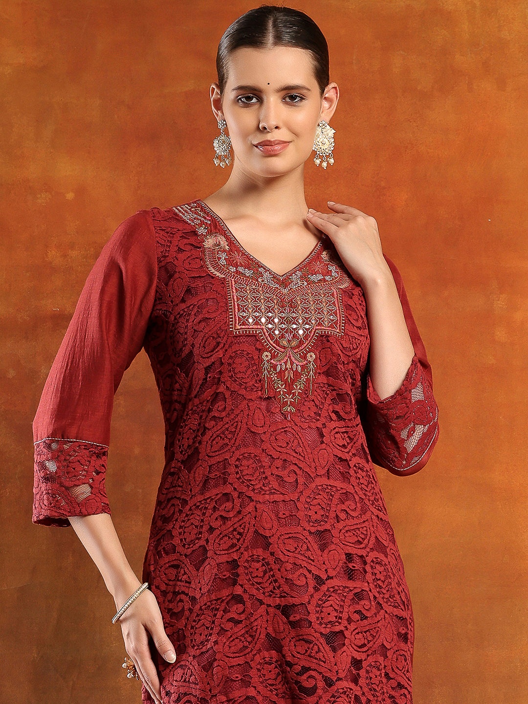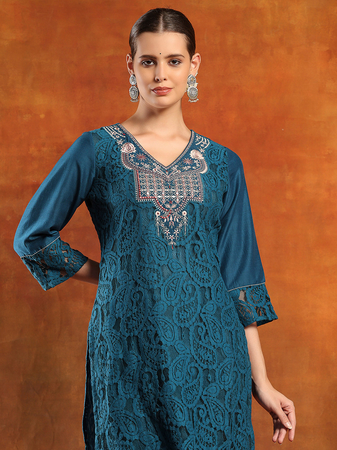 Cotton Kurti with Tonal Embroidery & Lace-Accented Yoke