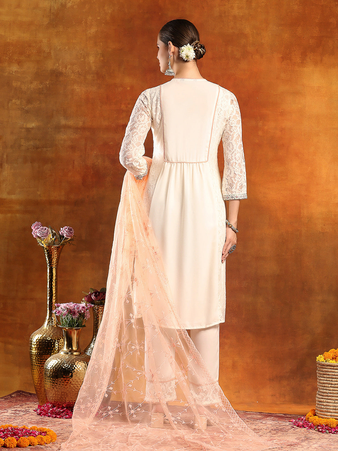 Crepe-Raschel Embroidered Kurta Set with Mesh Lace Dupatta